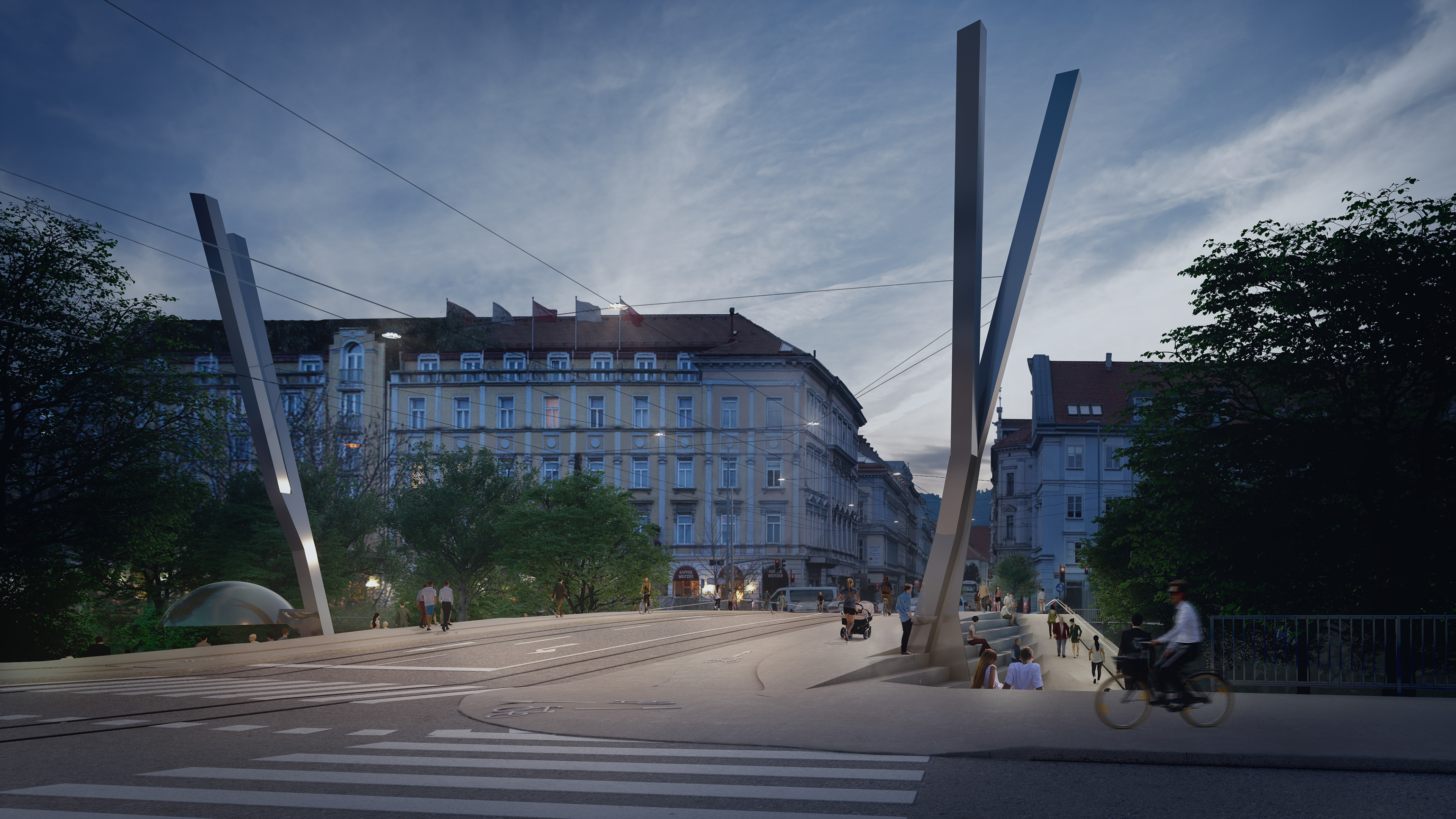 Visualisierung des Wettbewerbsbeitrages für den Neubau der Thegetthoffbrücke in Graz für Wolfgang Tschapeller. 1. Preis